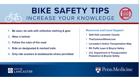 Our Lancaster County Coalition started an internal campaign within Penn Medicine Lancaster General Health to create a rotating message on bike safety throughout all clinical practices, as well as a one-page document available in the electronic medical record system.